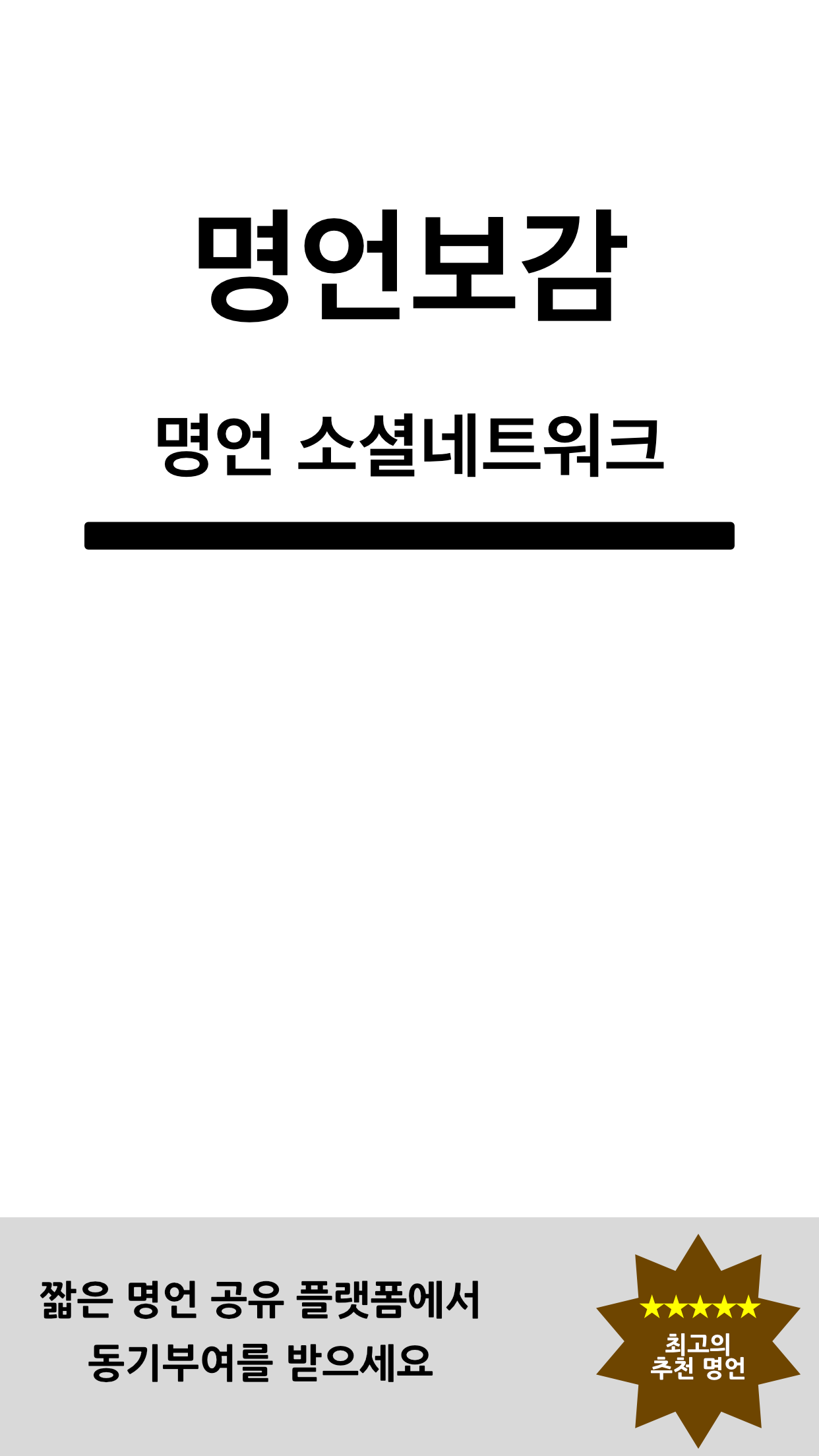 명언보감에서 세상 모든 명언을 한곳에 모으고 동기부여 받기 짧은 명언에는 삶의 지혜가 함축되어 있습니다. 이곳저곳에 흩어져 있는 짧은 명언들은 한곳에 모으고 공유할 수 있는 플랫폼입니다. 누군가의 훌륭한 명언을 마음속 담아 둔다면 하루하루 소중하고 행복해 질 것이라고 생각합니다. 남이 올려 놓은 명언들을 보거나 내가 찾은 새로운 명언을 공유해주세요. ---- 개발자 연락처 : 세종특별자치시 노을 070-7847-7359