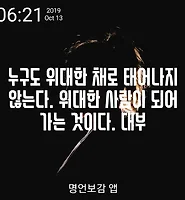 | 누구도 위대한 채로 태어나지 않는다. 위대한 사람이 되어 가는 것이다. 대부 (0) | 2019.10.13 |